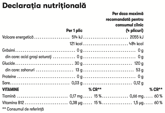 În timpul exercițiilor intense sub 1,5 ore, consumă 1 plic de gel energizant pe oră. Pentru eforturi între 1,5 și 2 ore, consumă 2 plicuri pe oră. Nu depăși 4 pliculețe pe zi. Produsul trebuie utilizat împreună cu o dietă echilibrată și un aport corespunzător de lichide.